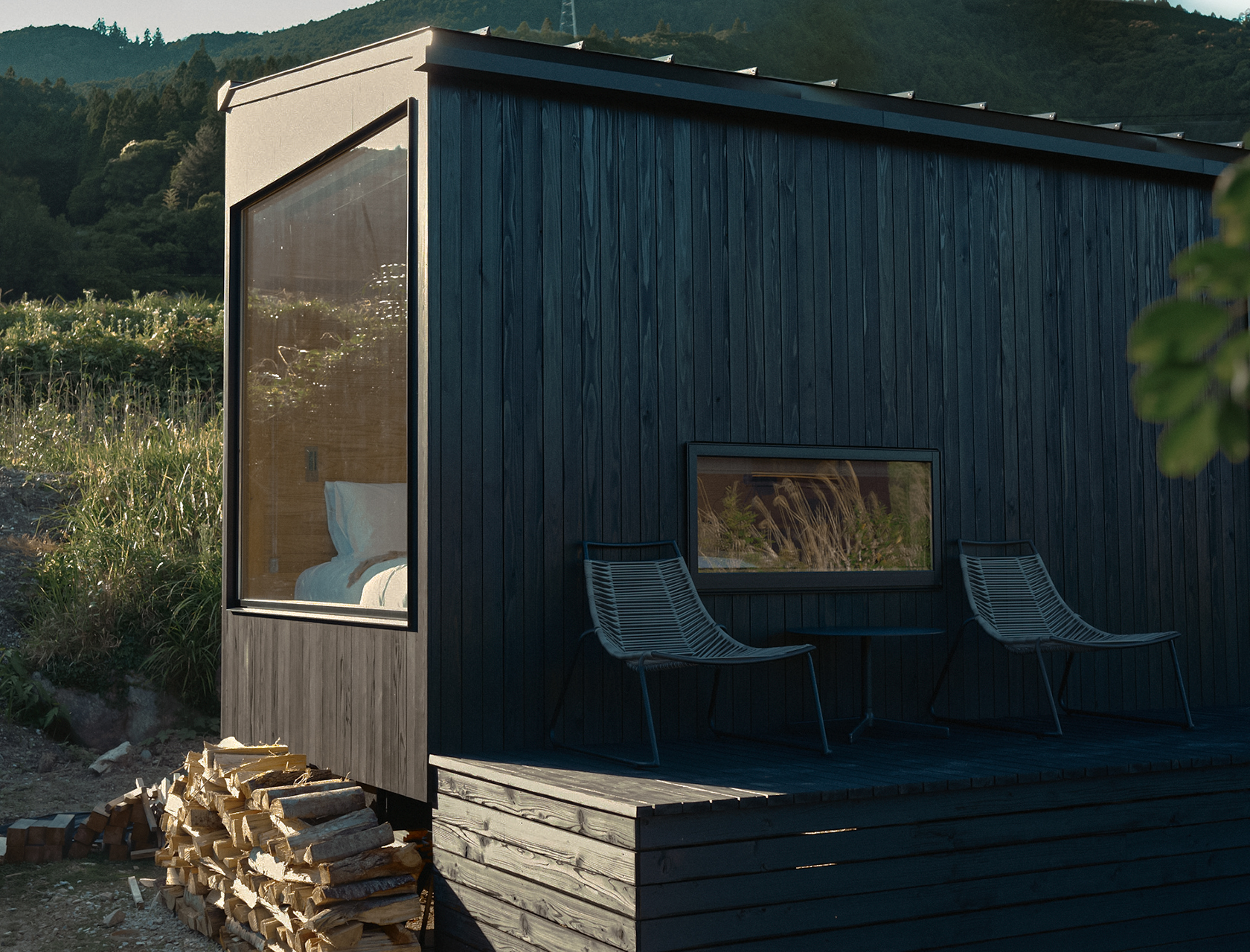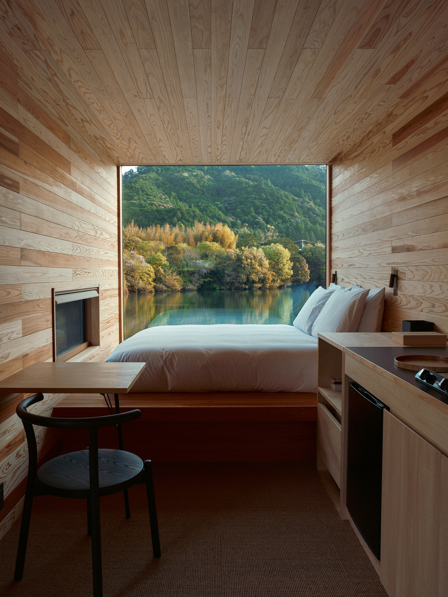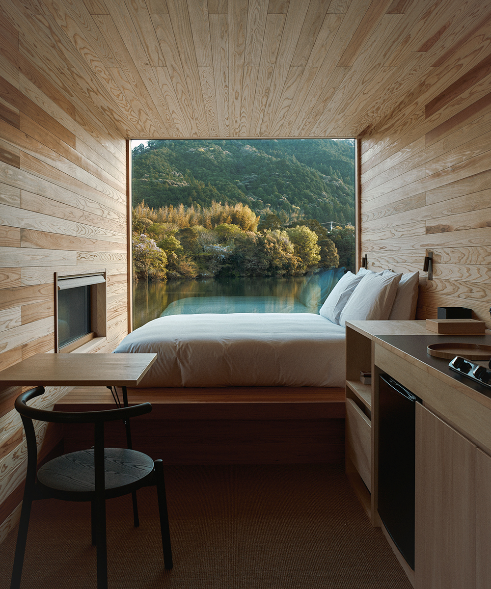 独立したプライベート空間を約束する、定員2名の特別なキャビンが2棟。どちらも、緑豊かな山々と穏やかな川の景色を一望できるロケーションです。地元の杉や檜を使った温もりのある建物には、クイーンサイズのベッドやキッチン、オープンデッキや庭もあり、暮らすように気ままに過ごせます。