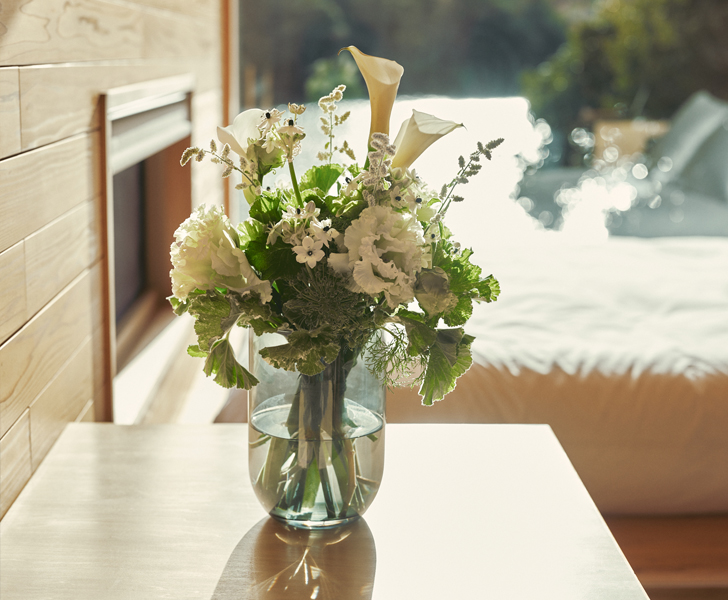 穏やかな水面を目前に臨む開放感。ベッドに横たわれば、視線の先に山々と水面だけが広がり、まるで湖に浮かんでいるかのような浮遊感を味わえます。名前の由来となったツツジのように、季節や時間帯によって多彩な表情を見せる景色を堪能して。